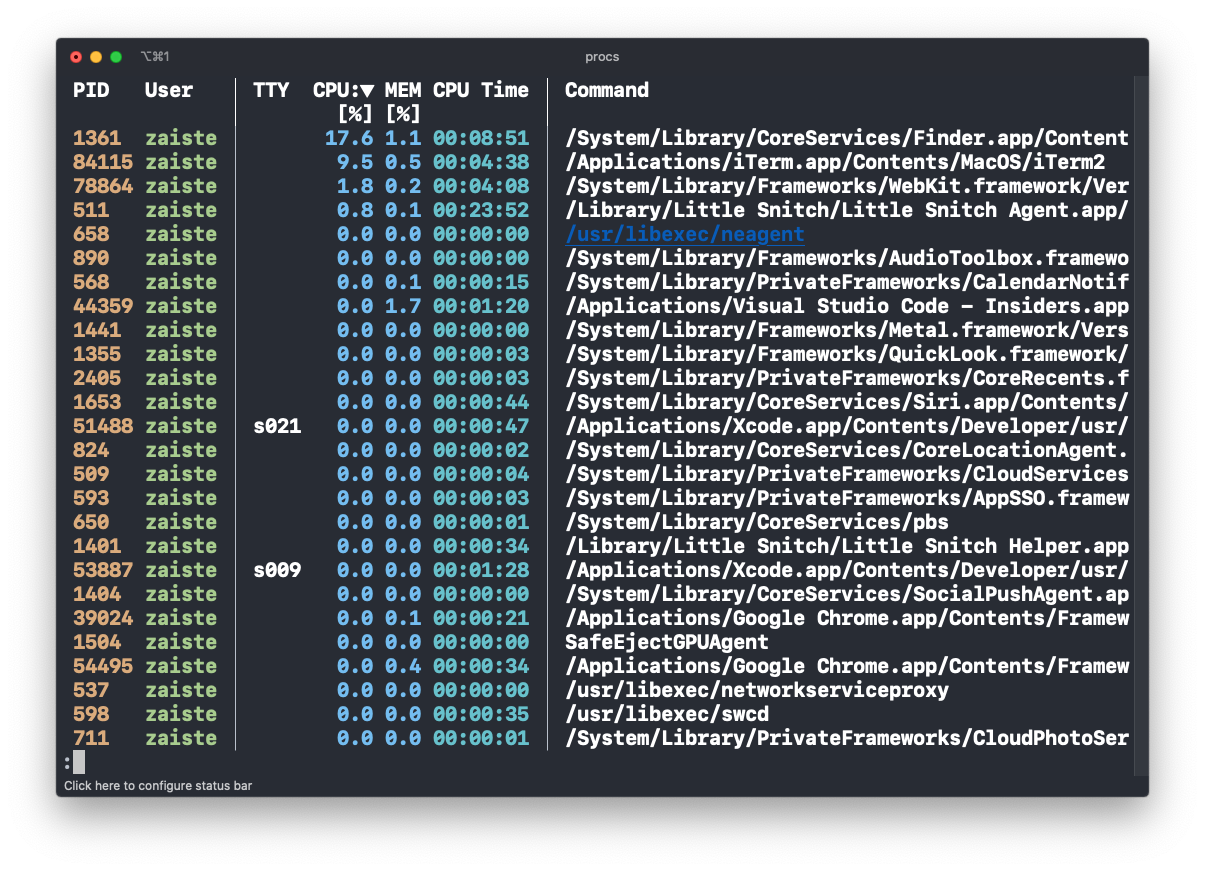 Note that procs gets the container information through UNIX domain socket, so Docker Toolbox on macOS (doesn’t use UNIX domain socket) is not supported. Docker Desktop for Mac is supported but not tested.